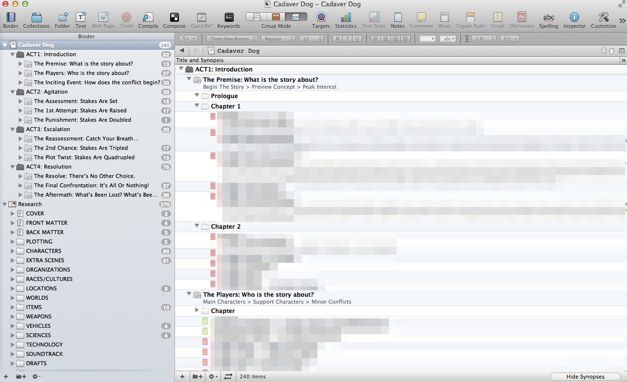 Okay, okay, okay, I’ve spent the last couple months redeveloping and gathering plot points for Cadaver Dog’s 18 characters and I’ve finally, just today, finished dumping them all into my writing stew pot. I organized the plot points by Main Characters, Plot Characters, Supporting Characters, and Element Characters within a 4 Act 12 Section Plot Structure, which prints out to 15 pages of pure thrilling psychotic potential.