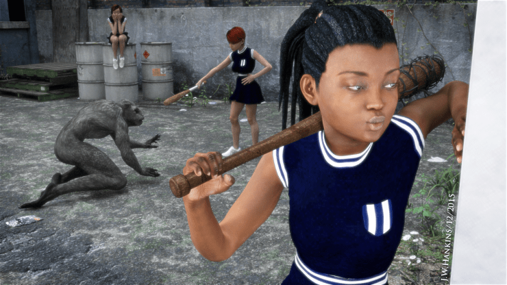 I was messing around this weekend and this scene popped in my mind. The girls of Clairborn High take matters in their own hands after spotting and tracking down a supernatural beastie looking for a unsuspecting meal.